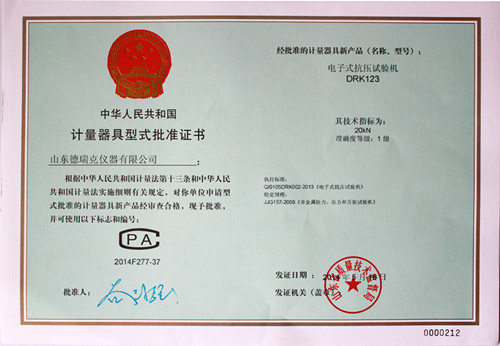近日,德瑞克接到市局通知,在濟(jì)南市質(zhì)量技術(shù)監(jiān)督局一樓計(jì)量器具型式許可證窗口領(lǐng)取到了電子拉力試驗(yàn)機(jī)型式批準(zhǔn)證書(證書編號(hào)2014F376-37),加上之前領(lǐng)取的電子式抗壓試驗(yàn)機(jī)(證書編號(hào)2014F277-37)、電子式壓縮試驗(yàn)儀(證書編號(hào)2014F278-37)的型式批準(zhǔn)證書,至此,德瑞克涉及的國(guó)家法定監(jiān)管的計(jì)量產(chǎn)品已全部獲得證書。